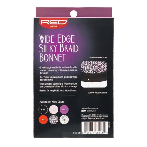 RED By Kiss Luxury Satin Wide Edge Braid Bonnet in Leopard combines premium satin construction with a wide elastic edge designed to protect braids, twists, and protective styles while you sleep or throughout the day. The smooth satin surface reduces friction and frizz, helping maintain style longevity and hair moisture. The generous wide-edge design ensures secure, comfortable fit without excessive tension. Perfect for anyone invested in protective styling and hair health maintenance.